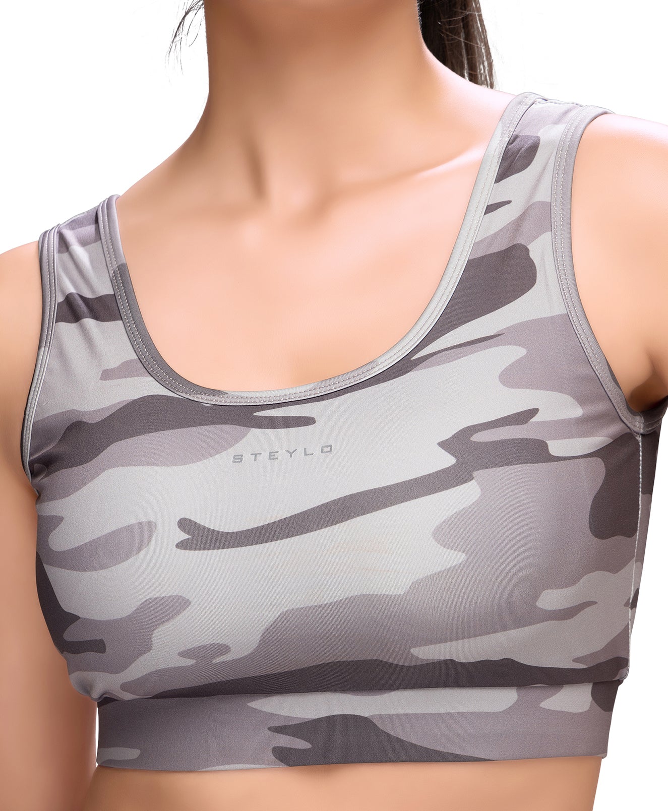 Stay bold and unstoppable with the Steylo STY-03 Sports Bra, featuring a stylish camouflage print that blends fashion with functionality. Designed for active women, this bra delivers medium support and unmatched comfort, making it ideal for gym sessions, yoga, jogging, or athleisure looks.